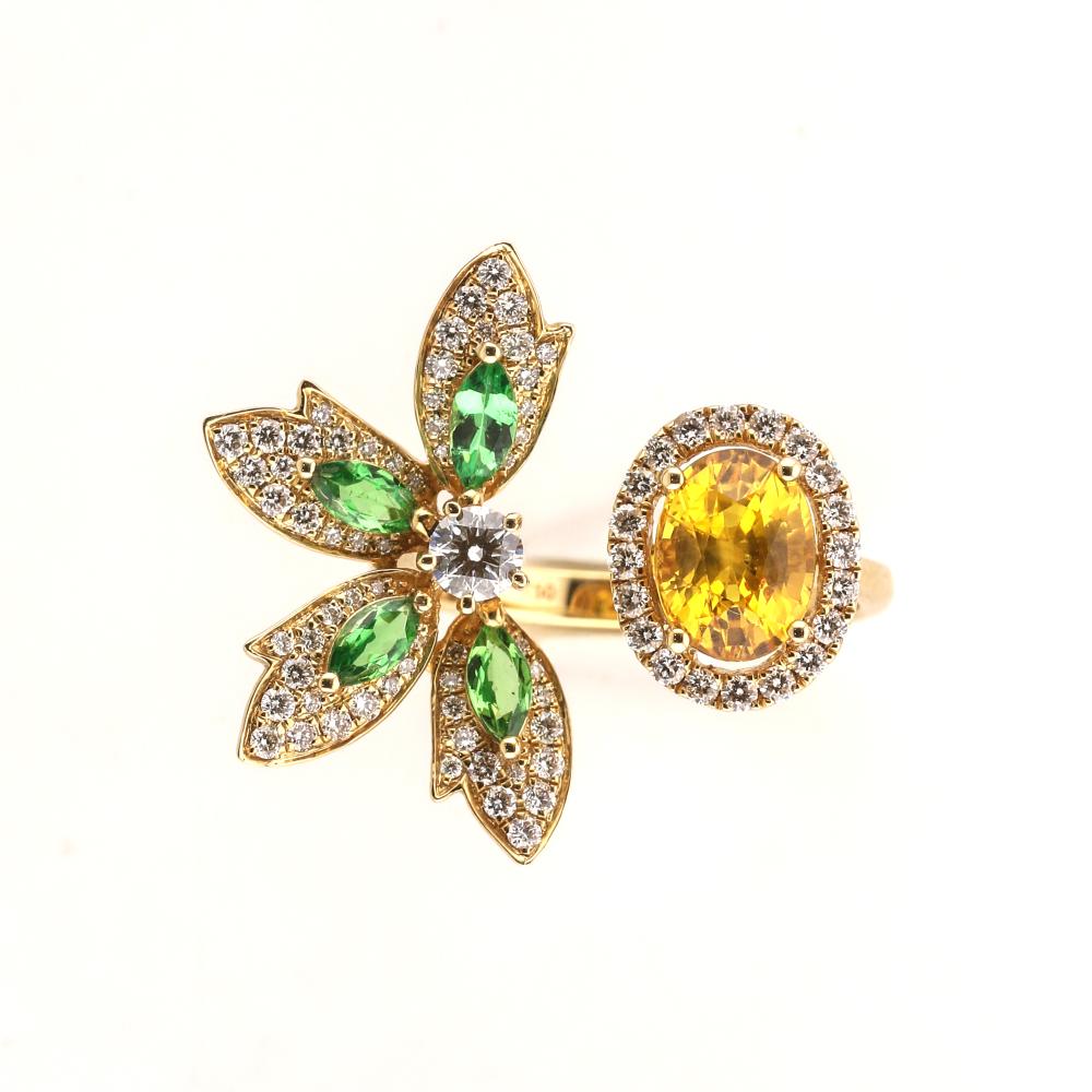 00R0334 - خاتم عيار 18 ذهب 4.49 جرام ألماس 0.70 قيراط زفير أصفر 1.92 قيراط غارنت أخضر 0.54 قيراط